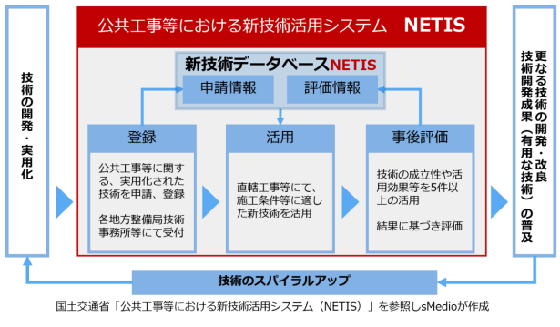 NETISとは、国土交通省が公共工事等での新技術の活用促進のため、新技術に関わる情報の共有および提供を目的として整備したデータベースシステムです。