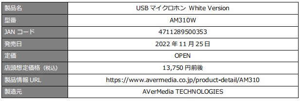 アバーメディア・テクノロジーズ株式会社(東京都台東区)は、配信者向け USB 接続コンデンサマイクとして、多くのストリーマーの方からご支持をいただいている「USB マイクロホン AM310」の限定生産モデルとしてホワイトバージョン「USB マイクロホン White Version AM310W」を 11 月 25 日より順次、下記の家電量販店や PC 販売店、オンラインショッピングサイトなどで販売開始いたします。