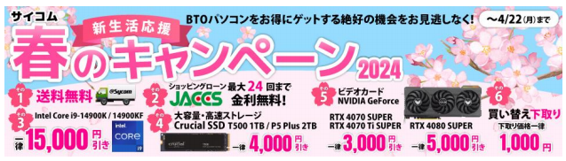 Intel® Core™ i9-14900K、14900KFの15,000円引きや最新のCrucial製高速M.2 SSD、NVIDIA® GeForce RTX™ 40 SUPER シリーズがお得に購入できる「サイコム 春の新生活応援キャンペーン2024」を3月8日(金)より開始